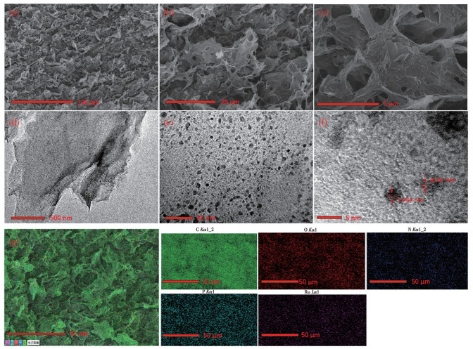 为了对所制备材料的形貌有直观的了解,首先使用SEM进行分析。如图 2a~2c所示,Ru/N/P/rGO呈现出良好的三维结构,rGO层相互穿插交叠在一起形成了多孔的网络特征结构,这种结构有利于催化反应的发生和物质的传输,使得反应物质与活性位点充分接触,并且有利于稳定钌纳米颗粒,抑制其聚集。进一步通过TEM观察Ru/N/P/rGO的形貌特征,从图 2d、2e中能够清晰地看出超薄的rGO堆叠形成三维结构的同时非常均匀地负载了钌纳米颗粒,且颗粒非常细小,粒径集中在2~3 nm,这对于金属催化活性位点的充分暴露有独特的益处。进一步通过高分辨率透射电镜(high resolution transmission electron microscope,HRTEM)来分析钌纳米颗粒,从图 2f中可以看出纳米颗粒的晶格间距分别为0.207和0.234 nm,分别归属于金属钌的(101)和(100)晶面。使用扫描电子显微镜-能量散射光谱仪(scanning electron microscopy-X-ray energy dispersive spectrum,SEM-EDS)对Ru/N/P/rGO的组成进行了分析,从图 2g中能够明显看出所制备的材料中存在N、P、Ru三种元素且分布非常均匀,说明N/P共掺杂的策略是成功的,并且均匀地负载了钌纳米颗粒催化剂。由于C和杂原子之间电负性和自旋密度的差异,N/P共掺杂能够诱导电荷从碳原子转移到相邻的N、P等杂原子上,从而有效调节反应物和中间体的吸脱附性能,最终提高碳载体的本征电催化活性。