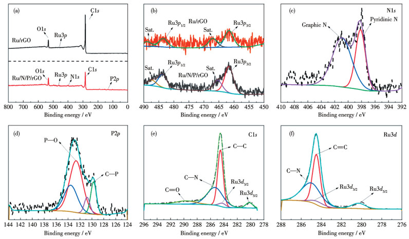 进一步利用XPS分析Ru/rGO和Ru/N/P/rGO的元素组成及价态。从图 4a的XPS全谱图中可以清晰地看出Ru/rGO和Ru/N/P/rGO存在显著的区别,Ru/N/P/rGO中可以明显观察到N、P、Ru三种元素的存在,说明N/P共掺杂是成功的,而且也成功负载了钌纳米颗粒。图 4b是Ru3p高分辨XPS谱图,Ru/rGO和Ru/N/P/rGO中均存在位于461.66 eV(Ru3p3/2)和483.77 eV(Ru3p1/2)的2个主峰,同时伴随着卫星峰。此外,Ru/N/P/rGO的N1s高分辨XPS谱图显示其在398.18和400.93 eV处有显著的分裂峰(图 4c),分别归属于吡啶N和石墨N。Ru/N/P/rGO的P2p高分辨谱图(图 4d)中存在2个显著的峰,位于129.73和132.65 eV,分别归属于C—P和P—O键,说明P元素也成功掺杂进入碳材料的晶格之中。图 4e是C1s高分辨谱图,其与Ru3d轨道峰发生了重叠。图中284.51、285.32、289.72 eV处的3个显著的谱峰分别归属于C=C、C—N、C=O。此外,280.20和284.60 eV处的峰分别是Ru3d3/2和Ru3d1/2对应的轨道裂分峰,与图 4f结果一致。
