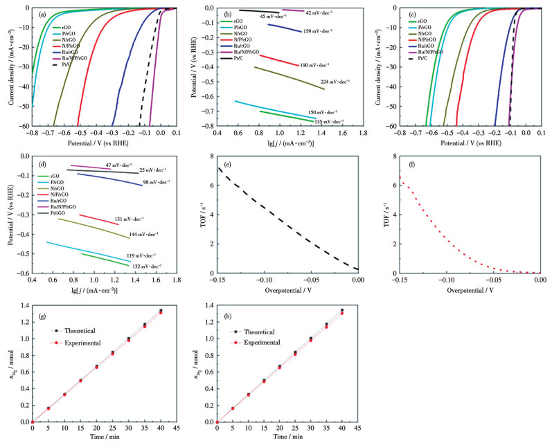 图 5 材料在1 mol·L-1 KOH中的(a) LSV曲线和(b) Tafel斜率; 材料在0.5 mol·L-1 H2SO4中的(c) LSV曲线和(d) Tafel斜率; Ru/N/P/rGO在(e) 1 mol·L-1 KOH和(f) 0.5 mol·L-1 H2SO4中的TOF; Ru/N/P/rGO在(g) 1 mol·L-1 KOH和(h) 0.5 mol·L-1 H2SO4中的法拉第效率