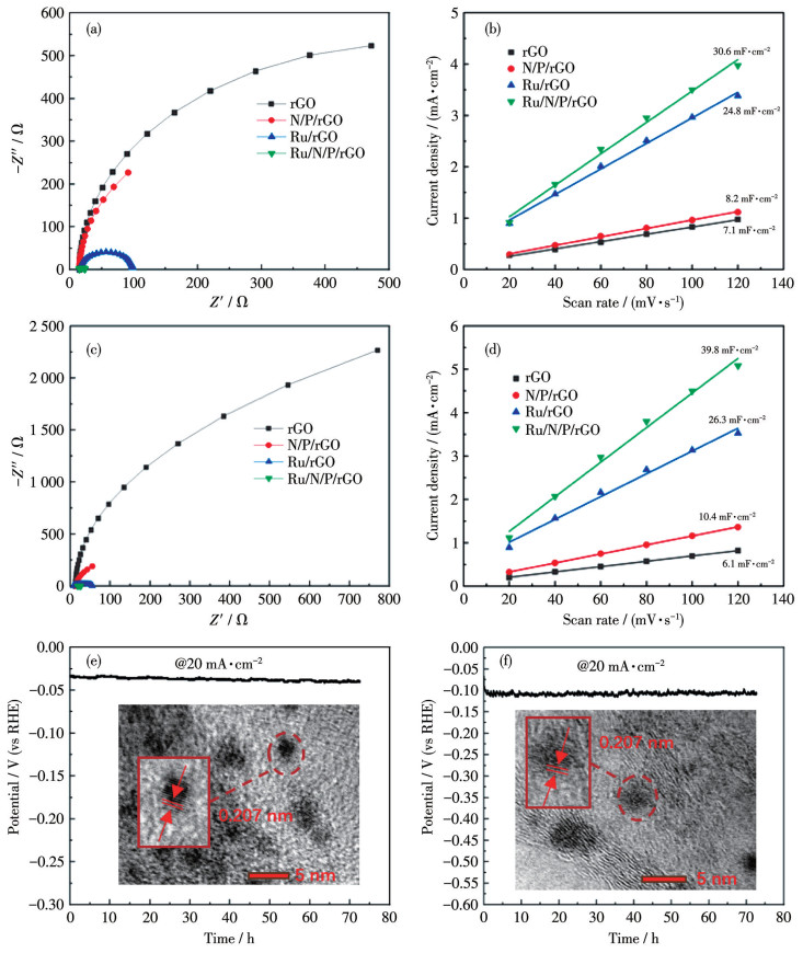 图 6. 材料在1 mol·L-1 KOH中的(a) EIS和(b) Cdl; 材料在0.5 mol·L-1 H2SO4中的(c) EIS和(d) Cdl; Ru/N/P/rGO在(e) 1 mol·L-1 KOH和(f) 0.5 mol·L-1 H2SO4中的长时间稳定性Figure 6. (a) EIS and (b) Cdl of the materials in 1 mol·L-1 KOH; (c) EIS and (d) Cdl of the materials in 0.5 mol·L-1 H2SO4; Long-term stability of Ru/N/P/rGO in (e) 1 mol·L-1 KOH and (f) 0.5 mol·L-1 H2SO4Inset: HRTEM images after stability testing.