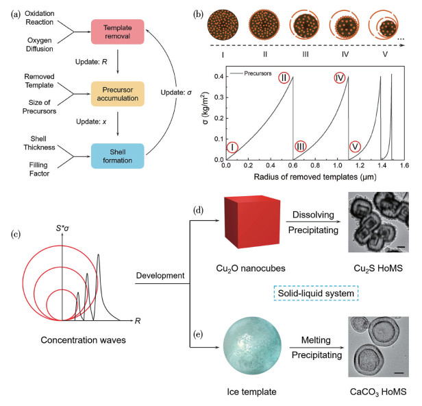 Figure 2 (a) Mathematic model of the HoMS simulating formation process; (b) σ evolution during template removal in STA; (c) Correlation between concentration waves and the formation of HoMS; Formation of (d) Cu2S HoMS and (e) CaCO3 HoMS (scale bar: 200 nm)[28]