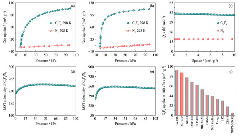 图 3 Al-TCPP在(a) 298 K和(b) 273 K下对C3F8、N2的单组分吸附等温线; (c) Al-TCPP吸附C3F8、N2的Qst; Al-TCPP在(d) 298 K和(e) 273 K下的C3F8/N2选择性; (f) Al-TCPP与其他多孔吸附剂对C3F8的吸附量(298 K、100 kPa)比较