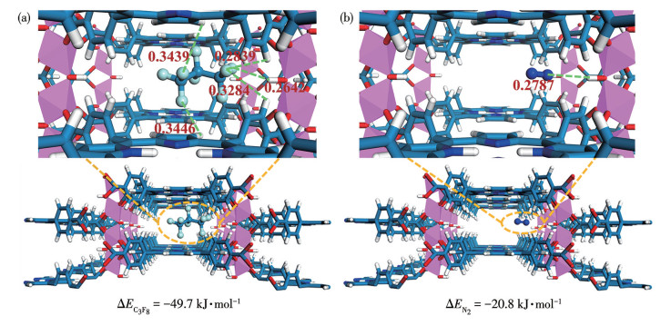为了进一步探究Al-TCPP对C3F8和N2在分子水平上的吸附机理,本工作通过 DFT 方法对 Al-TCPP中 C3F8和 N2的吸附构型进行优化。如图 4a 和图 4b所示,由于C3F8具有较大的分子直径,使得F原子能够与平板孔相邻层吡咯环上的 H 原子(C—F…H—C:0.343 9~0.344 6 nm)、相邻层苯环上的H原子(C—F…H—C:0.283 9~0.328 4 nm),以及 μ-OH 基团(C—F…HO—μ:0.264 2 nm)形成多重氢键相互作用。因此,Al-TCPP对 C3F8具有较高的结合能(ΔEC3F8=-49.4 kJ·mol-1)。相比之下,N2与 MOF 作用力较弱,仅与μ-OH基团(N≡N…HO-μ:0.264 2 nm)发生氢键相互作用,与Al-TCPP的结合能仅为-20.4 kJ·mol-1,远低于 C3F8。以上结果进一步表明 Al-TCPP 对 C3F8具有强的相互作用力,与实验结果一致。