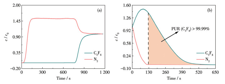 本工作采用多组分吸附穿透曲线分析仪(BSD MAB)进行了C3F8/N2混合物的分离性能测试。在装样前,需将Al-TCPP样品在真空环境下120 ℃活化10 h,然后装入固定床管中作为吸附柱(ϕ 6 mm×180 mm)。每次测量前,吸附柱需在10 mL·min-1的He流下120 ℃吹扫30 min。最后,将C3F8/N2二元混合气体(体积比5∶5)引入管道中,使其通过MOF吸附柱。采用质谱在线分析了穿出后气体的浓度。