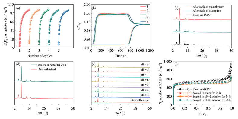 图 6 (a) Al-TCPP对C3F8的五次吸附循环和(b) C3F8/N2混合气体的五次穿透实验循环; (c) Al-TCPP在吸附循环和穿透循环后的PXRD图; Al-TCPP(d) 在水中浸泡24 h后的PXRD图和(e) 在酸或碱溶液中浸泡24 h后的PXRD图; (f) Al-TCPP在水、pH=3和pH=9溶液中浸泡24 h后的N2吸附-脱附等温线(77 K)