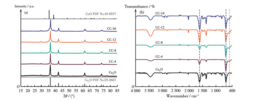 首先采用液相还原法制备Cu2O,参考前文献[26]并改进进行。将2.88 g十二烷基磺酸钠加入到443 mL的去离子水中,持续搅拌5 min,溶解形成均匀溶液。向溶液中加入10 mL 0.1 mol·L-1的CuSO4溶液,形成浅蓝色溶液,并将2 mL 1.0 mol·L-1 NaOH溶液匀速加入至上述体系中,待溶液变为深蓝色悬浮液。之后在上述溶液中加入45 mL 0.2 mol·L-1的抗坏血酸钠溶液,恒速搅拌5 min,陈化70 min以进行晶体生长。离心取得沉淀后,将沉淀洗涤数次,再置于真空烘箱中干燥,得到Cu2O粉末样品。将制备好的Cu2O在空气中煅烧,为获得最优化的复合材料,控制煅烧温度为140 ℃,煅烧时间分别为4、8、12和16 h,升温速率为5 ℃·min-1,所获得的样品分别标记为CC-4、CC-8、CC-12和CC-16。另外,作为对比,上述反应过程制备得到Cu2O后,在空气中500 ℃煅烧2 h以得到CuO样品。
