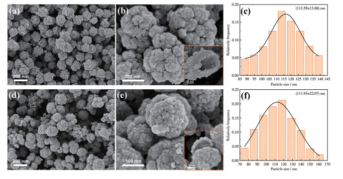 通过SEM对煅烧前后的系列铜氧化物催化剂进行表征分析。如图 2a~2c所示,通过液相化学还原法首先合成的Cu2O呈现相对均一的类树莓状纳米球结构,表面相对粗糙,破裂球状显示为空心纳米球,统计分析其平均粒径约为114 nm。煅烧后Cu2O/CuO催化剂仍维持原有的空心球状,且平均粒径约为112 nm(图 2d~2f),这表明煅烧未对催化剂微观形貌产生明显影响。催化剂所具有的小粒径空心球状结构利于其在催化过程中与反应物接触并增强反应中的传质过程。