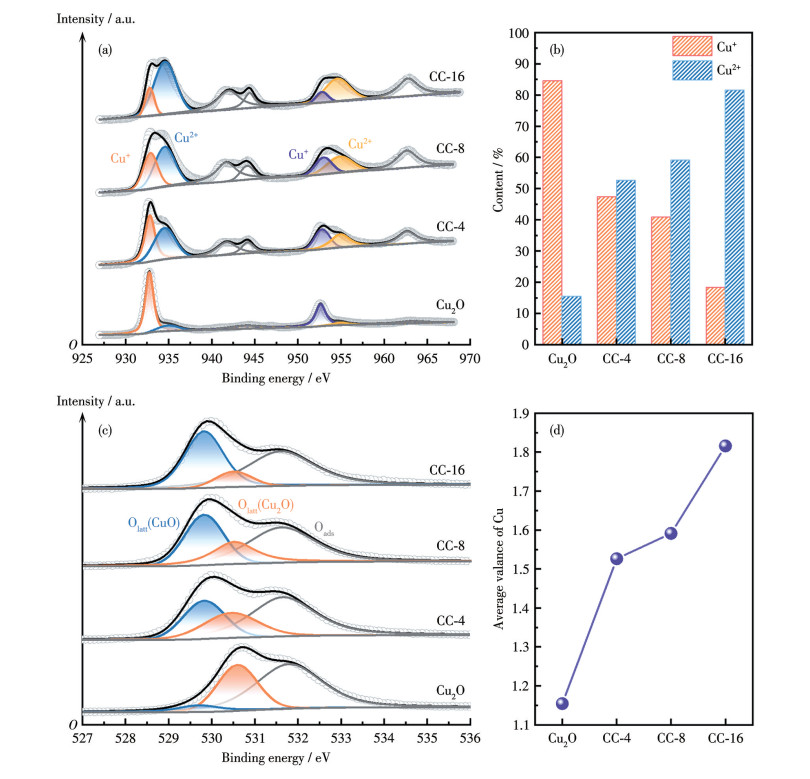 通过XPS分析催化剂的表面化学状态和电子结构(图 4)。图 4a为Cu元素的高分辨XPS谱图,位于约932.8与952.6 eV的峰分别对应于Cu+的2p3/2与2p1/2,位于934.4与934.6 eV的拟合峰则分别对应于Cu2+的2p3/2与2p1/2,这表明催化剂样品均为混合价态的铜氧化物[29-30]。未经煅烧的Cu2O的拟合曲线显示出低强度的Cu2+峰,并且卫星峰强度也极低,表明Cu2O中仅含有微量的Cu2+,这是由于样品在表征测试过程中存在轻微氧化,故存在少量CuO。随着煅烧时长增加,Cu2O/CuO中Cu+峰强度逐渐降低,Cu2+峰强度则逐渐升高。计算各价态相对含量,如图 4b所示,Cu+含量降低的同时Cu2+含量升高,表明随着煅烧时长增加,系列催化剂中Cu+逐渐转变为Cu2+,其中煅烧16 h所形成的CC-16样品中Cu2+含量最高达81%。