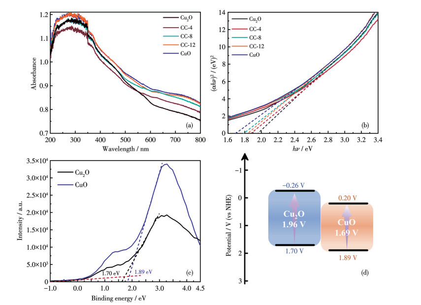 光催化剂的性能与其光学性质密切相关,我们采用UV-Vis吸收光谱研究催化剂的光吸收情况,结果如图 5a所示。Cu2O/CuO催化剂在可见光区域均有着明显吸收,且相较于单相Cu2O,其吸收范围具有一定的扩宽,复合结构的吸收边出现红移。这是由于复合相结构增强了催化剂的光吸收能力,进而有利于光催化过程中对光的吸收与利用[32]。如图 5b所示,通过Tauc法计算的Cu2O、CC-4、CC-8、CC-12和CuO催化剂的带隙分别为1.96、1.88、1.79、1.83和1.69 eV。Cu2O/CuO混合相结构的带隙小于纯相Cu2O,这归因于双相结构的形成改善了催化剂的光性能。