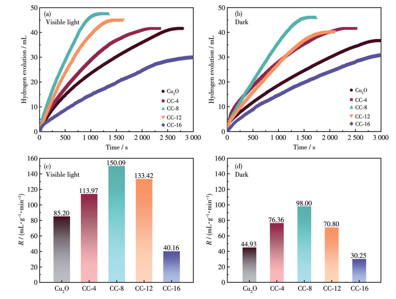 对所得系列Cu2O/CuO催化剂分别进行可见光与黑暗条件下催化AB水解性能测试。图 6a和6b分别显示了在可见光与黑暗条件下催化剂催化产生的氢气体积随时间变化的曲线。结果表明,相较于其它煅烧条件的催化剂,CC-8催化释放所有氢气的时间最短,且产氢体积接近于理论值。另外,在可见光条件下,CC-8的产氢时间明显低于黑暗条件。如图 6c所示,在可见光条件下,随着催化剂对应煅烧时长增加,其产氢速率呈现先升高后降低的类火山型变化。当煅烧时长为8 h时,CC-8催化水解反应速率最优,产氢速率可达150.09 mL·g-1·min-1,对应的TOF为1.91 min-1。复合催化剂的催化效率明显高于单相Cu2O。这种催化效率的提升源于复合催化剂中形成的适当混合价态结构,该结构能够对载流子进行有效分离。此外,对比黑暗条件下催化剂的催化反应速率可知,随着煅烧条件的改变,R值同样呈现火山型变化(图 6d)。混合价态结构的催化活性高于单相Cu2O,这表明即便在无光照条件下,Cu2O与CuO之间存在的协同催化作用也能明显提高催化效率。对于同一催化剂而言,其在黑暗条件下的催化活性均低于可见光条件下的催化活性。在可见光下,CC-8的R值为黑暗条件下的153%。这是由于在可见光条件下,催化剂所具有的适当能带结构利于其对光的吸收与有效利用,进而提高催化活性[17]。相比之下,其它过短或过长煅烧时间形成的Cu2O/CuO催化剂中未形成适当组分含量的结构,在催化过程中未能高效光能吸收,导致催化活性有所降低。