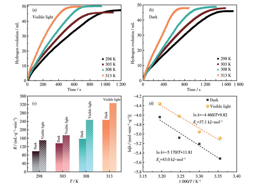 Figure 7 Catalytic hydrogen evolution curves (a, b) and corresponding R values (c) obtained at different reaction temperatures under visible light and dark conditions, and Arrhenius plots of ln k versus 1 000/T (d) of CC-8 catalysts