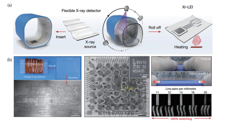 传统的刚性闪烁体探测器在X射线成像过程中会不可避免地导致非平面物体的严重失真,这一直是牙科诊断和无损检测领域的一个待解决问题。2021年,Ou等[39]巧妙地将X射线照射下能够发出长余辉光的NaLuF4∶Tb@NaYF4纳米晶闪烁体与柔性PDMS弹性体结合,开发了一种能够用于三维延迟X射线成像的柔性闪烁体屏。其成像原理如下:在X射线照射下,电荷载流子被捕获在柔性闪烁体屏中稀土纳米晶体的Frenkel缺陷中,随后将闪烁体屏加热至80 ℃,通过热激发使被捕获的电荷载流子释放、迁移进而发光,再使用相机采集热激发光,实现成像(图 10a)。这种柔性闪烁体屏甚至可以插入到折叠的电路板中,实现全景成像,空间分辨率超过20 lp·mm-1(图 10b),而使用传统平板闪烁体屏只能获得几乎无法分辨的重叠影像。