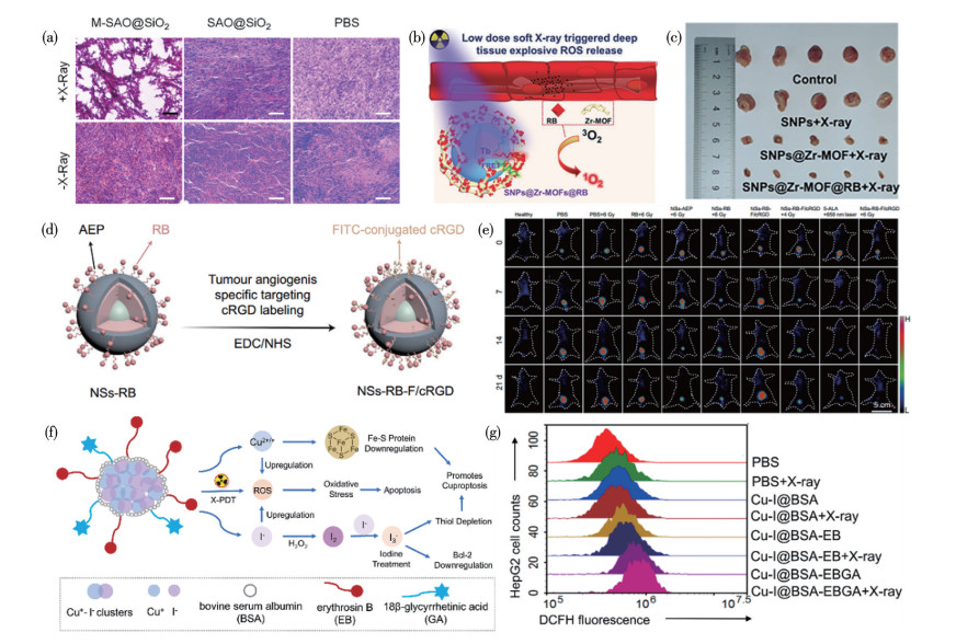 图 13 (a) H&E染色的经X-PDT治疗的肿瘤, 其中的组织结构严重受损, 细胞密度显著降低[45]; (b) X射线激活复合纳米探针结构及软组织X射线激活深部组织PDT的示意图; (c) 不同治疗方案12 d后4T1荷瘤小鼠的代表性肿瘤照片[101]; (d) 纳米传感器结构及表面FITC-cRGD功能化的示意图; (e) 非肌层浸润性膀胱癌小鼠术后第0、7、14和21 d的体内近红外Ⅱ区荧光成像图[33]; (f) Cu-I@BSA-EBGA诱导细胞死亡的机制示意图; (g) 不同治疗及对照组HepG2细胞在有或无X射线照射下的活性氧(ROS)生成情况[102]