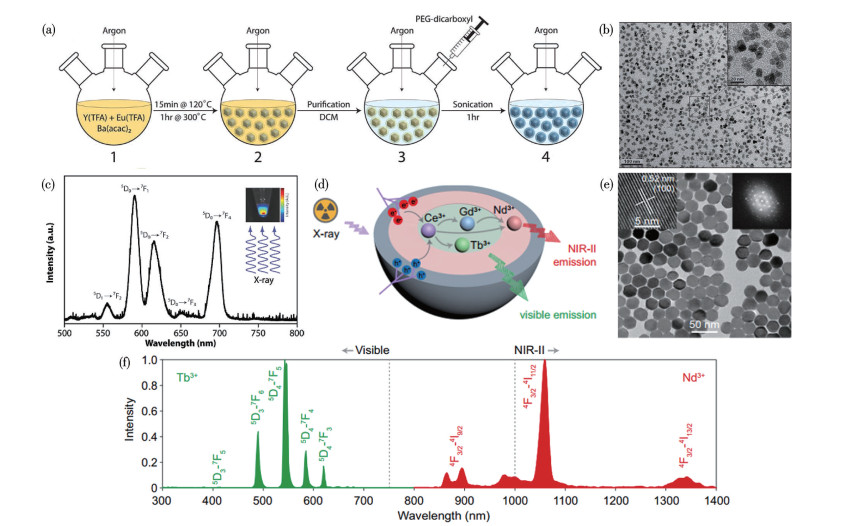 图 3 Ba0.55Y0.3F2∶Eu3+纳米颗粒的(a) 合成过程示意图、(b) TEM图和(c) XEL谱图[29]; 具有X射线激活绿色与近红外Ⅱ区发射特性的NaGdF4∶Ce, Tb@NaGdF4∶Nd@NaLuF4核壳结构纳米颗粒的(d) 发光机制示意图、(e) TEM图和(f) XEL谱图[33]