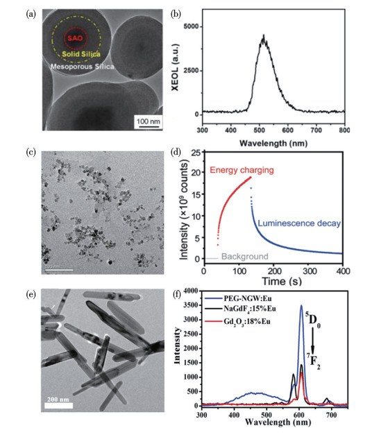 Figure 5 (a) TEM image and (b) XEL spectrum of SrAl2O4∶Eu2+@SiO2 NPs[45]; (c) TEM image of the long persistent luminescing SrAl2O4∶Eu2+ NPs, and (d) their energy charging and luminescence decay process[46]; (e) TEM image of NaGd(WO4)2∶Eu3+ nanorods; (f) Comparison of X-ray-excited luminescence intensities from different nanoprobe matrices doped with Eu3+ [47]