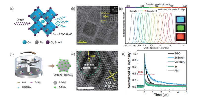 Figure 7 (a) Structural representation of perovskite quantum dots (QDs) (CsPbX3, with X=Cl, Br, I) and principle of X-ray induced luminescence; (b) TEM image of CsPbBr3 QDs; (c) Tunable luminescence spectra of the perovskite QDs under X-ray illumination[65]; (d) Schematic of solid-phase synthesis and (e) TEM image of ZnS(Ag)-CsPbBr3 scintillator; (f) Time-resolved RL decay of scintillators under pulsed X-ray excitation[69]