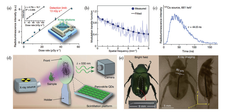 Figure 9 (a) Radioluminescence measurements for a CsPbBr3-based scintillator as a function of dose rate; (b) Spatial resolution of the X-ray imaging system, characterized by the modulation transfer function under 15 μGy of X-ray exposure; (c) Measured radioluminescence decay of the CsPbBr3-based scintillator; (d) Schematic of the experimental setup used for real-time X-ray diagnostic imaging of biological samples; (e) Bright-field (left) and X-ray (right) images of the sample[65]