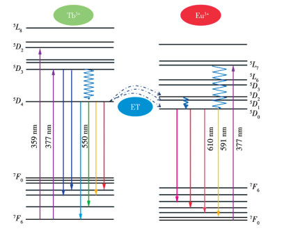 另一方面,随着Eu3+掺杂浓度的增大,Tb3+位于541和550 nm处的发射峰强度呈单调递减趋势,证明Tb3+将部分能量传递给了Eu3+以增强其发光[20]。图 14为Tb3+与Eu3+的能级示意图,该图可以解释它们之间的能量传递过程。Tb3+处于基态的粒子被377 nm光激发后跃迁到5D3激发态能级,随后部分粒子以辐射跃迁的形式释放能量并跃迁至7F4和7F3能级,发出特征波长的光。另一部分处于激发态的粒子先以非辐射的形式释放能量并弛豫至5D4能级,然后再以辐射跃迁的形式释放能量并返回基态能级,发出不同波段的光。此外,由于Tb3+的5D4能级与Eu3+的5D2、5D1和5D0能级较为接近,因此Tb3+会将部分能量传递给Eu3+。能量传递会消耗5D4(Tb3+)能级的能量,导致与5D4能级有关的发射峰强度降低,同时会增强与5D0(Eu3+)能级有关的发射峰强度。