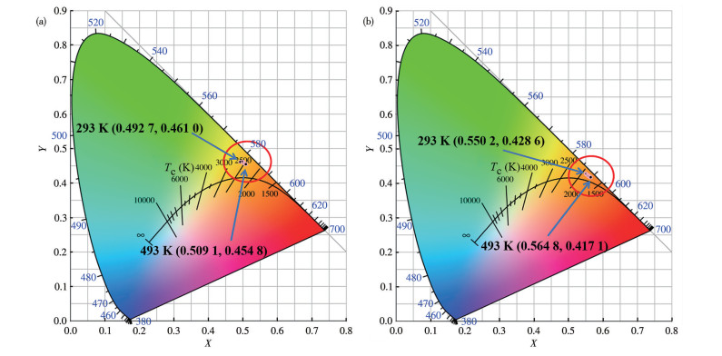 温度变化会影响样品的发射峰强度,可能导致材料的发光颜色发生改变。图 19为0.5%T0.3%E-PG和0.5%T0.3%E-GC随温度变化的色度坐标。可以观察到,在293~493 K温度范围内,0.5%T0.3%E-PG和0.5%T0.3%E-GC的色度坐标分别集中在黄光和橙光区,说明温度变化对色度坐标的影响很小。色度坐标的稳定性可以用色度偏移(ΔC)来描述[26]: