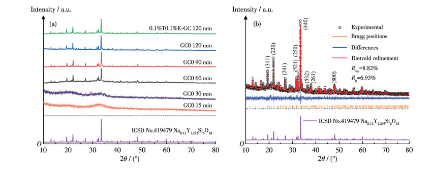 计算结果显示,670 ℃下保温30 min获得的GC0的结晶度仅约5%,而120 min时的结晶度提升至约81%。在高度结晶的情况下,GC0的XRD峰与标准Na8.12Y1.293Si6O18晶体卡片峰(ICSD No.419479)匹配良好,并且没有观察到其他杂质衍射峰,表明GC0中仅析出了Na8.12Y1.293Si6O18单一晶相。此外,该条件下得到的0.1%T0.1%E-GC的XRD峰位置与GC0一致且没有杂峰,表明少量稀土离子掺杂不会导致晶相发生改变。
