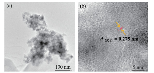 不同热处理时间下制备的GC0的SEM图像如图 4所示。从图中可以观察到,30 min热处理时样品中析出的晶粒尺寸较小且数量较少,平均粒径约为60 nm,此时玻璃相占比远高于晶相,这与从XRD图中获得的信息相一致。随着热处理时间的延长,GC0中析出的晶粒数量逐渐增多且尺寸持续增大,平均粒径由60 nm逐渐增长至263 nm。当热处理时间延长至90 min时,晶粒之间开始出现聚积,这一现象在120 min时更加明显,此时晶相含量超过了玻璃相。为进一步分析晶粒的相关信息,测试了热处理90 min得到的GC0的TEM图像,如图 5所示。从图 5a中可以观察到玻璃相紧密包裹着晶相,这与玻璃陶瓷良好的物理性能紧密相关。图 5b为对应的高分辨TEM(HRTEM)图像,图中可观察到清晰的晶格条纹,测得的晶面间距d约为0.275 nm,对应Na8.12Y1.293Si6O18晶体的(521)晶面,进一步证明了GC0中析出的晶相为Na8.12Y1.293Si6O18。