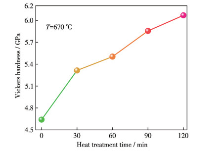 玻璃陶瓷的维氏硬度受晶粒尺寸和数量的影响显著,图 6对比了PG0与不同热处理条件下制备的GC0的维氏硬度。结果表明,GC0的维氏硬度显著高于PG0,且随着热处理时间的延长,维氏硬度提升效果越来越明显。当热处理时间为90和120 min时,GC0的维氏硬度较PG0分别提升了约26%和31%。