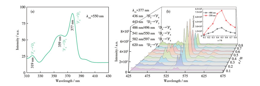 Tb3+作为典型绿光激活离子,在绿光显示与激光器等领域应用广泛。图 8a为0.1%T-GC的激发光谱,377 nm处存在的最强激发峰对应7F6到5D3能级的吸收跃迁。以377 nm为激发波长,得到xT-GC的发射光谱,图 8b中出现的发射峰分别归因于 5D3→7F4(436 nm)、5D3→7F3(443 nm)、5D4→7F6(486、496 nm)、5D4→7F5(541、550 nm)、5D4→7F4(582、597 nm)和5D4→7F3(620 nm)的辐射跃迁。随着Tb3+浓度增大,特征发射峰强度先增强后减弱,当掺杂浓度为0.5%时发射峰强度最大,超过此浓度后观察到明显的浓度猝灭现象。