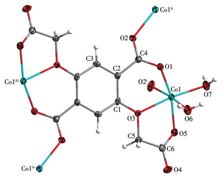 As illustrated in Fig. 1, the asymmetric unit of complex 1 contains one Co(Ⅱ) ion, half of a BCTA4- ligand, and two coordinated water molecules. Each Co1 ion coordinates with four oxygen atoms (O1, O2, O3, and O5) from two BCTA4- ligands and two oxygen atoms (O6 and O7) from two coordinated water molecules, respectively, yielding one slightly deformed octahedral configuration. The Co—O bond lengths are between 0.201 21(16) and 0.216 44(16) nm, and the O—Co—O bond angles vary from 77.27(6)° to 172.38(7)°, and are similar to those in Co(Ⅱ) complex[22].