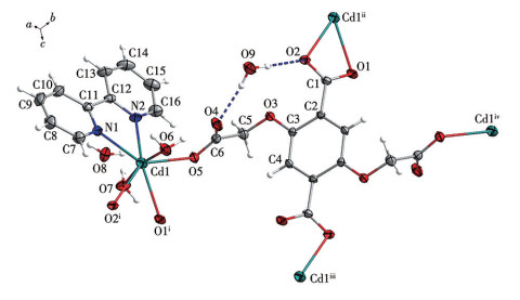 The synthesis was the same as that of 3, except that CoCl2·6H2O was replaced by Cd(CH3COO)2·2H2O (0.053 3 g, 0.2 mmol). The white crystals of 5 suitable for X-ray diffraction analysis were obtained with a yield of 32% based on Cd(Ⅱ). Elemental Anal. Calcd. for C16H19CdN2O9(%): C, 38.76; H, 3.86; N, 5.65. Found(%): C, 38.30; H, 3.95; N, 5.58. IR (KBr, cm-1): 3 424(w), 1 593(vs), 1 475(s), 1 439(m), 1 357(s), 1 246(m), 1 204(m), 1 059(m), 1 017(s), 858(w), 768(m), 736(w).