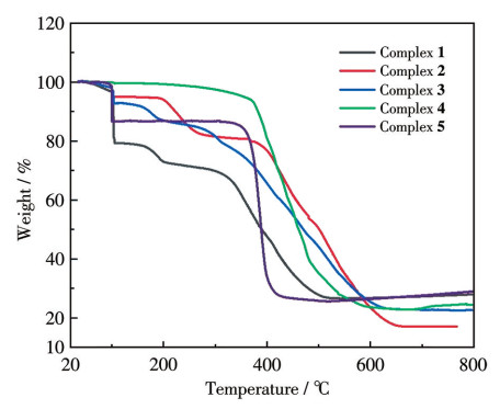 The crystal structures of complexes 1-5 were determined by single-crystal X-ray diffraction. Reflection data were collected at room temperature on a Bruker APEX Ⅱ area detector diffractometer[31] equipped with a graphite-monochromatic Mo radiation (λ=0.071 073 nm) with ω-2θ scan mode at 293(2) K. Empirical absorption corrections were applied to all data using the SADABS program. The structure was solved by direct methods and refined by full-matrix least squares on F2 using SHELXTL-2014 software[32-33]. All non-hydrogen atoms were located by direct methods and subsequent difference Fourier syntheses. All hydrogen atoms were located by geometrical calculations, and their positions and thermal parameters were fixed during the structure refinement, with C—H lengths of 0.093-0.097 nm and O—H length of 0.082 nm. Crystallographic data and pertinent information are given in Table 1. Selected bond lengths and bond angles are given in Table S1 (Supporting information), and hydrogen bond lengths and bond angles are given in Table S2.