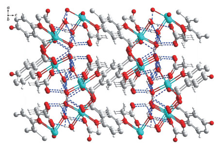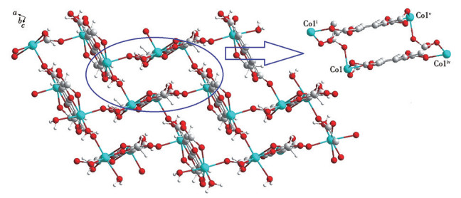 Each BCTA4- ligand is coordinated with four cobalt ions by octadentate bridging (Scheme 1). The two oxygen atoms (O2, O2) of each BCTA4- ligand coordinate with two nearby cobalt ions (Co1 and Co1), respectively, and connect the adjacent cobalt ions to form a 2D network structure (Fig. 2). In the 2D network structure, there are parallelogram structures formed by four ligands and four cobalt ions. The distances between Co(Ⅱ) ions (Co1…Co1 and Co1…Co1) are 0.487 53(5) and 0.894 27(6) nm, and the angles between Co(Ⅱ) ions (Co1…Co1…Co1 and Co1…Co1…Co1) are 55.231(6)° and 124.769(7)°, respectively. In complex 1, there are a lot of hydrogen bond interactions between carboxyl oxygen atoms from BCTA4- ligand and coordinated water molecules. Intermolecular O—H…O hydrogen bonds between three oxygen atoms (O1, O4, and O5) of two carboxyl groups from BCTA4- ligand and two oxygen atoms (O6 and O7) from two coordinated water molecules in the packing structure connect the adjacent 2D network to form a 3D hydrogen bond network (Fig. 3).