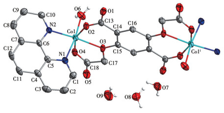 Complexes 2 and 3 are zero-dimensional structures, and their crystal structure are very similar. Take the crystal structure of 2 as an example (the asymmetric unit of 3 is shown in Fig. S1). As illustrated in Fig. 4, the asymmetric unit of 2 contains one Co(Ⅱ) ion, half of a deprotonated BCTA4- ligand, one Phen ligand, one coordinated water molecule, and three crystal lattice water molecules. Each BCTA4- ligand is coordinated with two cobalt ions by hexadentate bridging (Scheme 1). The Co(Ⅱ) ion is also a six-coordinated octahedron configuration, which coordinates with three oxygen atoms (O2, O3, and O4) of the BCTA4- ligand, two nitrogen atoms (N1 and N2) of two Phen ligands, and one oxygen atom (O6) from a coordinated water molecule, respectively. The Co—O bond lengths are 0.200 69(18), 0.203 65(18), 0.209 9(2), and 0.224 53(17) nm. The Co—N bond lengths are 0.211 2(2) and 0.214 4(2) nm. The O—Co—O bond angles vary from 76.03(7)° to 156.60(7)°, the O—Co—N bond angles vary from 86.28(8)° to 170.22(8)°, and the N—Co—N bond angles are 78.31(8)°, which are similar to those in Co(Ⅱ) complex[22].