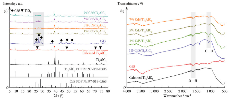 To investigate the crystal structure and crystallinity of the materials, XRD and FTIR analyses were conducted, as shown in Fig.1a and 1b. The XRD pattern of pristine Ti3AlC2 exhibited distinct diffraction peaks at 9.69°, 19.34°, 34.29°, and other characteristic planes, confirming its high purity and layered structure (PDF No.97-062-0306). After calcination at 550 ℃, a slight diffraction signal appeared near 25.3°, attributes to the (101) plane of TiO2, suggesting minor surface oxidation[9, 12, 23]. Pure CdS displayed diffraction peaks matching the hexagonal wurtzite structure (PDF No.97-019-0563). The XRD patterns of xCdS/Ti3AlC2 heterostructures exhibited the characteristic peaks of both CdS and Ti3AlC2, with increasing CdS crystallinity as the doping content increased, confirming successful heterostructure formation. FTIR spectra (Fig.1b) further revealed the functional groups on the material surfaces. Calcined Ti3AlC2 exhibited absorption peaks in the 500-1 000 cm-1 range attribute to Al—O, Ti—O, and Ti—C vibrations, which were absent in pristine Ti3AlC2[24]. Both calcined Ti3AlC2 and CdS displayed peaks at 1 650 and 3 400 cm-1, corresponding to O—H vibrations from adsorbed water[25-26]. CdS exhibited additional peaks at 1 410, 1 195, and 1 108 cm-1, associated with C—O stretching vibrations[27]. The xCdS/Ti3AlC2 heterostructures retained the characteristic peaks of both materials, with increasing CdS content enhancing the peak intensity. These results confirm the successful integration of CdS into Ti3AlC2, which enhances the material′s optical response and photocatalytic properties.