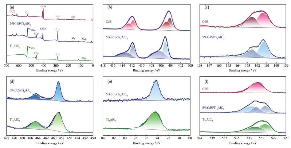 The chemical composition and valence states of the prepared materials were further investigated by XPS. Fig.3 displays the XPS spectra of pristine CdS, calcined Ti3AlC2, and the 5%CdS/Ti3AlC2 heterostructure. The Cd3d peaks at 405.15 and 411.91 eV are consistent with the reported values of Cd3d5/2 and 3d3/2 peaks, respectively[32]. In contrast, the peaks at 406.61 and 413.46 eV correspond to the Cd—N bond[33]. After composite formation, these peaks in the 5%CdS/Ti3AlC2 spectrum exhibited a slight positive shift (approximately 0.20 eV), indicating a change in the local electronic environment of Cd, likely due to electron transfer between CdS and Ti3AlC2. Similar behavior was observed in the S2p spectrum, pristine CdS showed peaks at 161.38 and 162.56 eV (S2-), while the heterostructure presented a slight shift toward higher binding energy, further confirming strong interfacial interaction[29]. Fig.3e shows the Ti2p spectrum of Ti3AlC2, in which 531.80 eV peaks can be assigned to Ti—C, while peaks at 530.37 and 533.26 eV belong to Ti—O in the Ti3AlC2 sample[34-35]. These signals were retained in the composite, with no significant shift, suggesting that the Ti3AlC2 framework remains structurally stable. For the Al2p region, a peak at 74.31 eV was observed in both Ti3AlC2 and CdS/Ti3AlC2, consistent with Al in the MAX phase. The O1s spectrum exhibited three fitted peaks located at approximately 530.5, 531.6, and 532.6 eV, corresponding to lattice oxygen in Al2O3, surface Ti—O species, and chemisorbed oxygen or hydroxyl groups (—OH), respectively[36].