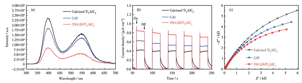 To gain further insights into the photocatalytic performance of the CdS/Ti3AlC2 heterostructures, their charge separation efficiency and carrier dynamics were comprehensively investigated. To evaluate the charge separation efficiency of the samples, their PL spectra were obtained at an excitation wavelength of 255 nm. As shown in Fig.5a, the PL spectra exhibited intense emission peaks at approximately 520 and 380 nm, indicating the rapid recombination of photoinduced charge carriers[41]. The incorporation of CdS into Ti3AlC2 significantly decreased the intensity of PL peaks, indicating a substantial increase in the separation efficiency of the samples[42]. The TPR of the prepared photocatalysts was measured to elucidate the effect of CdS on carrier separation and transport. As illustrated in Fig.5b, the TPR of 5%CdS/Ti3AlC2 heterostructures was notably more pronounced than that of calcined Ti3AlC2 samples. Furthermore, the 5%CdS/Ti3AlC2 sample exhibited the highest photocurrent density, which aligned well with its superior performance in photocatalytic degradation[43]. As shown in Fig.5c, the EIS Nyquist plot displays negative values for imaginary and real components, enabling the direct determination of charge-transfer resistance from the radius of the semicircle. A smaller arc or curve indicates a lower charge-transfer resistance, indicative of enhanced electron mobility and conductivity, which leads to an improved photocatalytic performance[44]. The semicircle radius was lower for 5%CdS/Ti3AlC2 than for the calcined Ti3AlC2 and CdS samples. This suggests that 5%CdS/Ti3AlC2 exhibited a lower charge-transfer resistance during the photodegradation experiment, thereby demonstrating a higher process efficiency than the original material. This implies that CdS/Ti3AlC2-based heterostructures exhibit enhanced capacity for charge separation and migration, thereby augmenting the efficiency of photocatalytic degradation.