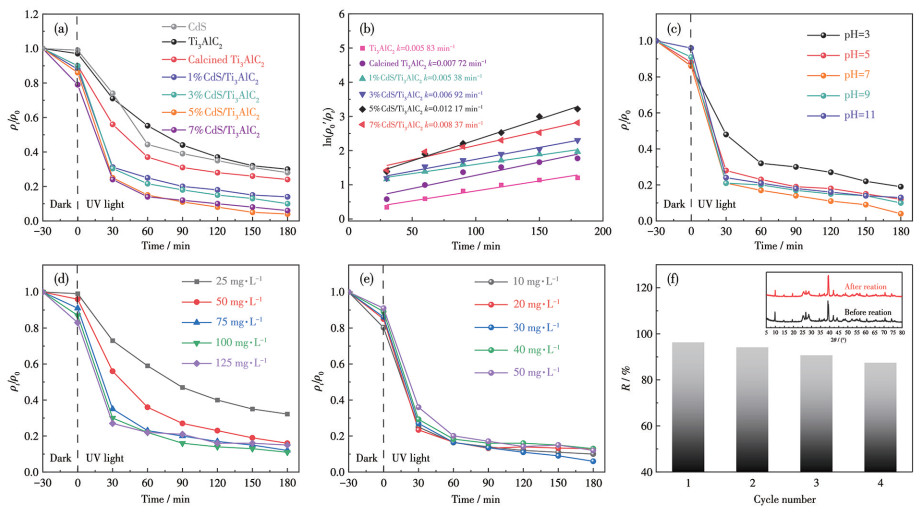 Figure 6 (a) Photocatalytic degradation of TC by different catalysts under UV light irradiation and (b) the corresponding kinetics curves; Impact of (c) initial pH, (d) catalyst dosage, and (e) TC mass concentration on the degradation performance of the 5%CdS/Ti3AlC; (f) Four repetitive cycles of photocatalytic degradation of TC by 5%CdS/Ti3AlC2 under UV light irradiation and XRD patterns of 5% CdS/Ti3AlC2 for before and after degradation reaction (Inset)