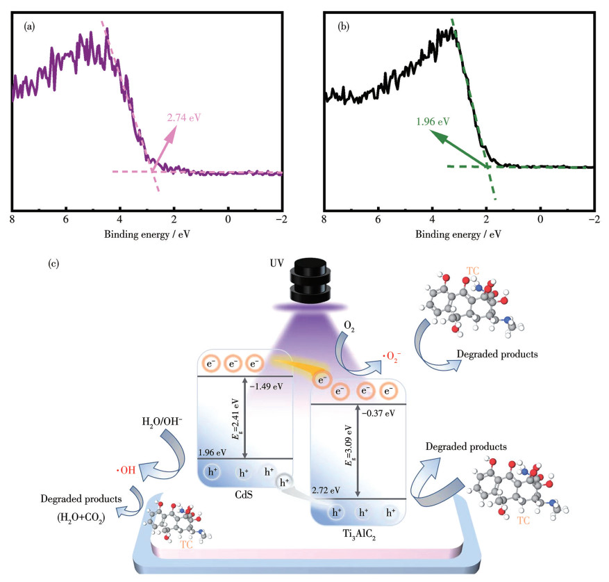 Based on the analysis and discussion above, this study proposed a comprehensive mechanism for the photocatalytic degradation of TC by the CdS/Ti3AlC2 heterostructure catalyst. The integration of CdS with calcined Ti3AlC2 leads to the formation of a well- defined and continuous heterojunction, enabling intimate interfacial contact between the two components. This structural configuration effectively suppresses the recombination of photogenerated electron-hole pairs, promotes more efficient charge carrier separation and migration, and ultimately enhances the overall photocatalytic performance. According to the UV-Vis DRS analysis, the bandgap energies of CdS and Ti3AlC2 were calculated to be 2.41 and 3.09 eV, respectively. To validate the energy band structure, XPS was employed to determine the valence band maximum (VBM) of the materials. The results indicate that the VBM of Ti3AlC2 and CdS were situated at 2.74 and 1.96 eV, respectively. These values indicate that the VB potential of the material is sufficient to oxidize water or hydroxide ions to generate hydroxyl radicals, and the results are consistent with EPR and quenching experiments. The schematic illustration of the band alignment and heterostructure formation is shown in Fig.8. The photocatalytic degradation process was predominantly driven by the presence of superoxide radicals, indicated by the symbol ·O2-. Furthermore, h+ and ·OH were identified as contributing factors to the degradation efficiency. Furthermore, UV-Vis DRS results suggest a reduction in the band gap of Ti3AlC2 following CdS coupling. Under UV light irradiation, both CdS and Ti3AlC2 were excited, generating electron-hole pairs. The transfer of photogenerated electrons from the CdS conduction band (CB) to the Ti3AlC2 CB was facilitated by the built-in electric field and energy band alignment. This process suppresses recombination, thereby prolonging carrier lifetimes and enhancing photocatalytic activity. In the case of photocatalytic degradation of TC, the photogenerated electrons on Ti3AlC2 can react with electron acceptors (e.g., O2) to form ·O2-, which are strong oxidative agents that can directly degrade organic pollutants. A preliminary examination of the subject reveals that intermediate products may include decarboxylation products, ring-opening structures, and the final low-molecular-weight organic acids and inorganic ions, among other elements[20, 39, 58-60]. The involved photocatalytic reaction processes are described as: