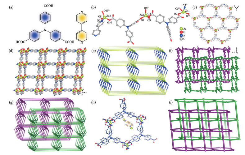 Figure 1  (a) Structural formulas of H3NTB and bipy; (b) Coordination environment of three Zn(Ⅱ) ion in compound 1; (c) View of 2D double-layer structure along the c-axis; (d) View of 3D structure along the b-axis; (e) (3, 8)-connected topology network; (f) Two-fold interpenetrated network and (g) topological structure; (h) View of the [(NTB)6(Zn3)3] loop threaded by one bipy rod; (i) 3D polyrotaxane structure