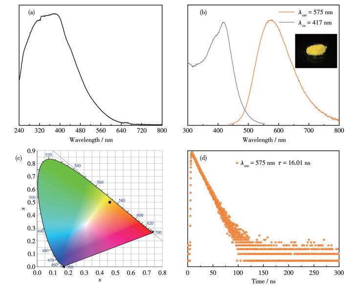 Figure 2  Photophysical properties of compound 1 (a) UV-Vis absorption spectrum in solid state measured at room temperature; (b) Normalized excitation and emission spectra; (c) CIE-1931 chromaticity diagram showing the photoluminescence emission; (d) Photoluminescence decay curve