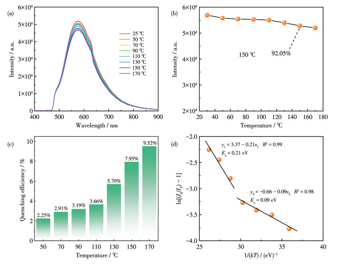 图 4  化合物1的温度依赖光致发光: 在25~170 ℃之间的荧光光谱(a); 温度与最大发光强度的关系图(b); 不同温度相对于室温下发光强度的热猝灭效率(c); ln[(I0/IT)-1] vs 1/(kT)曲线(d)