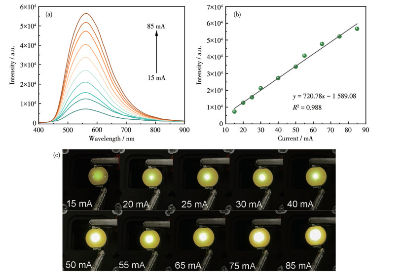 Figure 5  Application of compound 1 in LED: (a) photoluminescence spectra of yellow PC-LED device under various drive currents; (b) relationship between the maximum emission intense and drive currents of the PC-LED device; (c) luminescence photographs of the PC-LED device under various drive currents