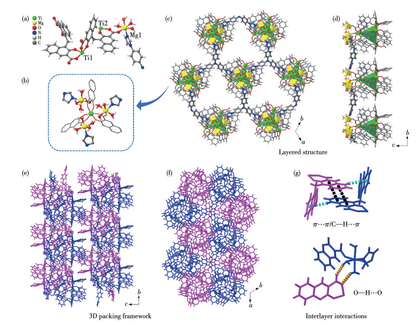 c. As shown in Fig.2a and 2b, the asymmetric unit of PTC-378 possesses one third of the Ti4L6 cage, one third of the tipa ligand, one Mg2+ ion, and four coordinated H2O molecules (Solvents and (Me2NH2)+ countercations could not be located because of high disorder). In PTC-378, each Mg center is six-coordinated by one carboxyl O atom from the Ti4L6 cage, one N atom from one tipa ligand, and four coordinated H2O molecules to build a distorted tetrahedral coordination geometry. The Mg—O bond distances vary from 0.204 2 to 0.215 0 nm, and the Mg—N bond distance is 0.214 0 nm. In PTC-378, each tipa ligand adopts a saturated triangular coordinated mode, and each Ti4L6 cage captures three Mg2+ ions by one vertex of the tetrahedron. The connectivity between Ti4L6 cages, Mg2+ ions, and tipa ligands creates a 2D layer structure (Fig.2c and 2d). Such layers further pack into a 3D dense superstructure (Fig.2e and 2f), and adjacent layers are stabilized by the π⋯π (ca. 0.36 nm), C—H⋯π (C⋯π: ca. 0.39 nm), and O—H⋯O (O⋯O: 0.26-0.29 nm) interactions (Fig.2g).$ \stackrel{-}{3} $ Figure 2