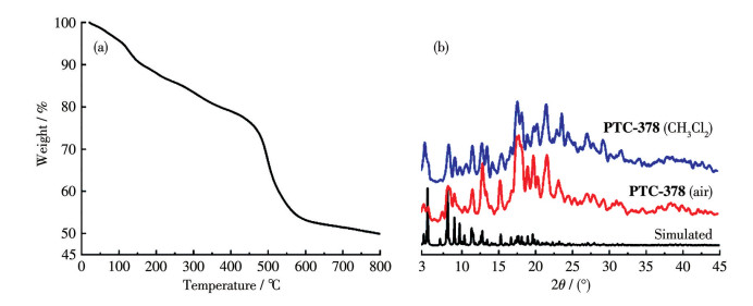 In order to evaluate the thermal stability and phase purity of PTC-378, TGA and PXRD were performed. The TGA curve of PTC-378 was measured in a N2 atmosphere, with the temperature ranging from room temperature to 800 ℃ at a heating rate of 10 ℃·min-1. The TGA curve of PTC-378 indicated an approximate 20% weight loss below 400 ℃ (Fig.3a), attributed to the removal of guest and coordinated H2O molecules, after which the structure began to decompose. The residuals following the decomposition of the compound were likely to be titanium dioxide (TiO2) and magnesium oxide (MgO).