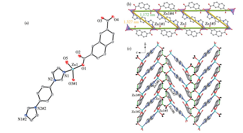 Figure 2. Crystal structure of Zn-CP: (a) coordination environment of Zn2+ with 75% thermal ellipsoids; (b) 1D ladder chain structure; (c) 3D supramolecular structure formed by hydrogen bonding interaction表 3