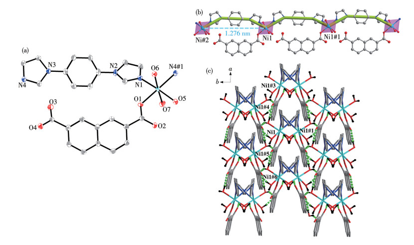 D—H…A d(D—H)/nm d(H…A)/nm d(D…A)/nm ∠D—H…A/(°) Zn-CP O5—H5A…O4#1 0.087 0.182 0.265 9(2) 161.1 O5—H5B…O4#2 0.087 0.187 0.271 0(2) 160.5 Ni-CP O5—H5A…O4#1 0.087 0.179 0.264 6(4) 166.5 O6—H6A…O2#2 0.087 0.193 0.278 6(4) 167.7 O6—H6B…O4#1 0.087 0.20 0.280 6(4) 152.6 O7—H7B…O3#3 0.087 0.23 0.280 7(4) 117.5 Symmetry codes: #1: 2-x, -1/2+y, 1/2-z; #2: -1+x, -1+y, z for Zn-CP; #1: 1/2+x, 3/2-y, 1/2+z; #2: 1+x, y, z; #3: x, 1-y, 1/2+z for Ni-CP. Ni-CP结晶于单斜晶系的Cc空间群,其不对称单元包含1个Ni2+、1个NDA2-配体、1个1,4-DMB配体和3个配位H2O分子(图 3a)。Ni-CP中的每个Ni2+均采取六配位模式,处于变形八面体构型中心。Ni2+在赤道平面与来自2个1,4-DMB配体的2个N原子(N1和N4#1),以及1个NDA2-配体和1个配位水的2个O原子(O1和O5)连接,而轴向位置则与来自不同配位水分子的2个O原子(O6和O7)配位。Ni—O键的键长范围在0.206 9(3)~0.213 6(3) nm之间,Ni—N键的键长为0.204 7(3)和0.206 0(3) nm,O—Ni—O的键角范围为88.02(11)°~177.60(11)°,N—Ni—O/N的键角范围为86.88(11)°~175.99(12)°。如图 3b所示,相邻Ni2+间通过1,4-DMB配体连接,形成沿c轴无限延伸的一维扭曲梯形链状结构,Ni…Ni间距离为1.276 nm。但与Zn-CP不同的是,Ni-CP中虽然NDA2-配体也完全去质子化,但其只有一个氧原子与金属中心配位,为一单齿端基配体。最终一维梯形链间通过配位水分子与NDA2-羧酸氧原子间的氢键相互作用堆叠形成如图 3c所示的三维超分子结构,氢键信息详见表 3。
