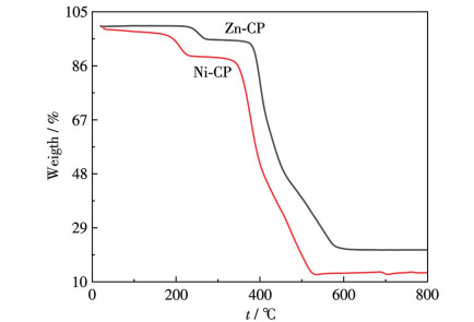 为了便于后续性质和应用的研究,分别大量合成Zn-CP和Ni-CP且将批量合成的二者进行PXRD和TGA表征。使用Mecury软件对单晶解析出的cif文件进行PXRD模拟,再将模拟结果与实测结果对比。如图 4所示,Zn-CP和Ni-CP模拟所得到的PXRD图主要峰位置和峰形与实验所测得的PXRD图基本吻合,表明合成的2种配位聚合物具有很高的相纯度。TGA曲线如图 5所示,从图中可知Zn-CP在230~285 ℃间失重约4.40%,这是配合物中1分子配位水受热失去导致(理论计算值4.47%);而Ni-CP在25~246 ℃范围内失重约10.68%,对应于配合物中3分子配位水的受热损失(理论计算值10.06%)。随着温度的进一步升高,Zn-CP从370 ℃开始急剧失重,骨架逐渐坍塌,直至600 ℃附近;而Ni-CP在334 ℃之后框架开始分解,并持续到533 ℃左右趋于稳定。以上结果表明二者具有较好的热稳定性,骨架分别直至370 ℃和334 ℃才开始坍塌。