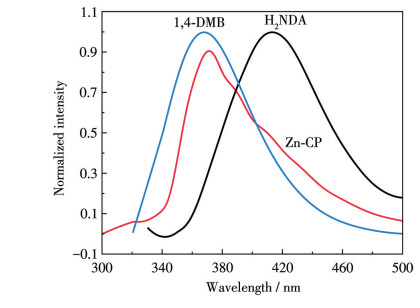鉴于具有闭壳电子构型的Zn(Ⅱ)与含π共轭体系的配体合成的配位聚合物具有较好的荧光特性,故依次以275、274、281 nm为激发波长在室温条件下测定Zn-CP、H2NDA、1,4-DMB的固态荧光发射光谱,实验结果如图 6所示。由实验结果可知,它们分别在363、414、367 nm处显示出最强发射峰,将Zn-CP和游离H2NDA、1,4-DMB配体的荧光发射光谱进行对比,可以看出其发光是基于H2NDA、1,4-DMB配体的共同作用,且相对于2个配体,Zn-CP最大发射峰分别蓝移51、4 nm,这可能是由于1,4-DMB配体与Zn(Ⅱ)金属离子之间的配位作用所造成的[24]。