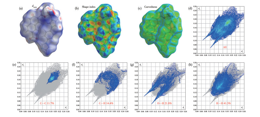 Hirshfeld表面和二维指纹图分析是分析晶体结构分子间相互作用的重要手段及方法。为进一步研究Zn-CP和Ni-CP中的相互作用情况,分别借助CrystalExplorer软件直接计算2个配位聚合物的Hirshfeld表面[25]。图 8a~8c依次展示了Zn-CP的dnorm、Shape index、Curvedness图。dnorm图的红色斑点说明Zn-CP有短程的氢键相互作用,结合表 3氢键数据可反映出其存在O—H…O氢键,而由Shape index图红色和蓝色相对的区域证明Zn-CP存在π…π堆积相互作用。整个分子和C…C、C…H、O…H、和H…H相互作用的二维指纹图及对Hirshfeld表面的贡献百分数如图 8d~8h所示,其中与π…π堆积相关的H…H相互作用对Hirshfeld表面的贡献占指纹区的主要部分,且贡献占比达到31.6%;而分子间O…H氢键则占比达25.3%。