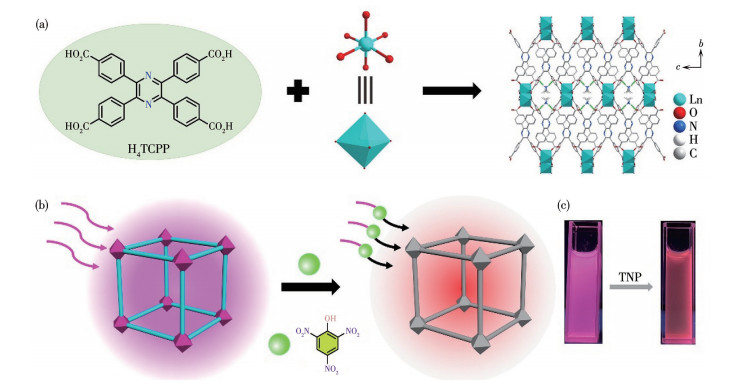 金属有机框架(MOFs)是由金属离子/簇与有机配体自组装得到的有序多孔晶态材料,具有高的表面积、可调的孔结构以及丰富的化学组成,在众多领域展现出较大的应用潜力[8-9]。MOFs的核心优势在于其框架结构高度可定制。通过精准调控有机配体与金属中心,能够为MOFs引入特定的功能位点,从而实现多样化的功能应用[10-11]。然而,MOF传感器在实际应用中仍面临多重挑战:(1) 化学稳定性不佳(尤其在水环境中)[12-13]。尽管大量MOFs被合成并在特定性能上表现优异,但其稳定性不足的问题严重制约了应用范围[14]。(2) 在复杂环境基质(如含多种干扰物的废水)中,实现对目标分析物(如TNP)的高选择性与高灵敏度识别仍是一个关键挑战。(3) 开发具有明确、可靠且可增强检测信号的响应机制(如比率型荧光传感)对于提高MOFs检测准确性和抗干扰能力至关重要。针对以上挑战,镧系金属有机框架(Ln-MOFs)展现出独特优势,有望改善MOFs材料的选择性和信号可靠性。镧系离子(如Eu3+、Tb3+)因其f-f电子跃迁而具有强发光性、长荧光寿命、大Stokes位移和特征性的锐利发射峰。这些特性不仅为高灵敏度的传感提供了基础,其指纹式的发射光谱更有利于通过多发射中心或比率型检测策略实现高选择性识别[15-16]。同时,硬酸性Ln3+离子通常能形成在水溶液中具有优异化学稳定性的骨架结构,有助于满足实际应用中对材料耐久性的要求[17]。