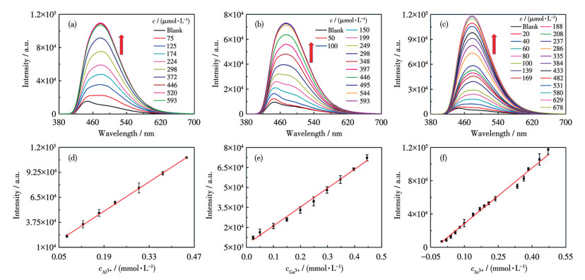 Based on the signal-noise ratio of being 3σ/k (σ represents the relative standard deviation of emission intensity of blank samples across ten tests; k is the slope), the detection limits of compound 1 to Al3+, Ga3+, and In3+ ions were calculated to be 2.31, 3.06, and 2.78 μmol·L-1, respectively. Notably, the detection limit of Al3+ was lower than the maximum allowable concentration of Al3+ in drinking water (7.41 μmol·L-1) as stipulated by the World Health Organization (WHO). All three detection limits are remarkably low and comparable to those reported for other probes targeting these three metal ions[8-11], indicating that 1 serves as an excellent probe for their efficient detection.
